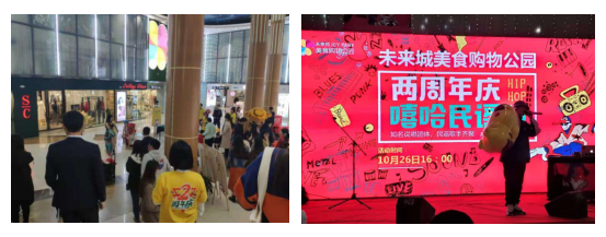 线下活动方面,针对未来城购物公园的消费客群定位,本次店庆PR活动不管是在内容的选择还是在互动礼品的选择上,都比较契合自身消费群体的喜好。选择了年轻群体接受度较高的“COSPLAY表演+嘻哈民谣音乐节+蛋糕分享派对”等形式为购物中心引流。表演及巡游期间同时发放大量提前收集的商家代金券及礼品以达到为商家进行宣传及引流的效果。